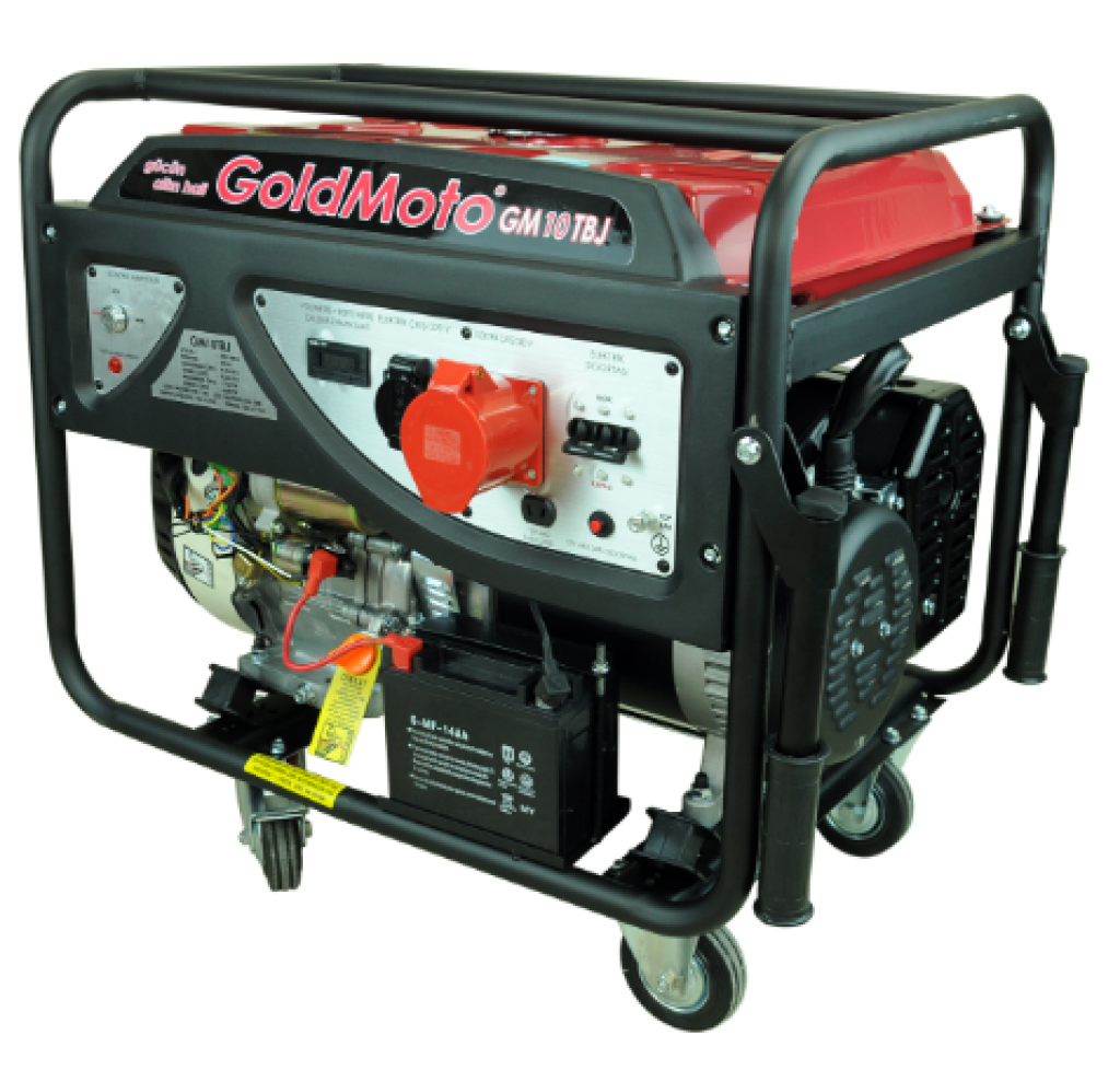 GoldMoto GM10TBJ, 15 HP gücündeki benzinli motoru ve 10 kVA maksimum çıkışıyla; ev, tarla, sera, atölye, yapı-inşaat, fabrika ya da büyük elektrik ihtiyacı olan işletmeler için ideal trifaze jeneratördür.